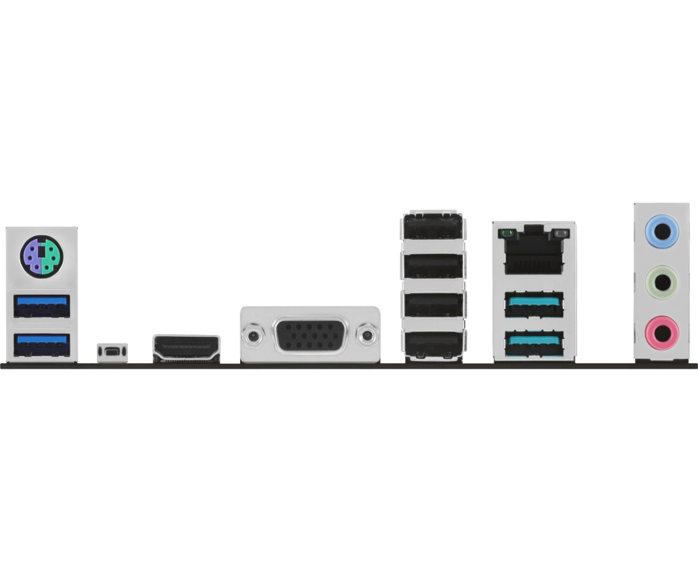 PS/2, 4 x USB 2.0, 2 x USB 3.2 Gen1, 2 x USB 3.2 Gen2, VGA, HDMI