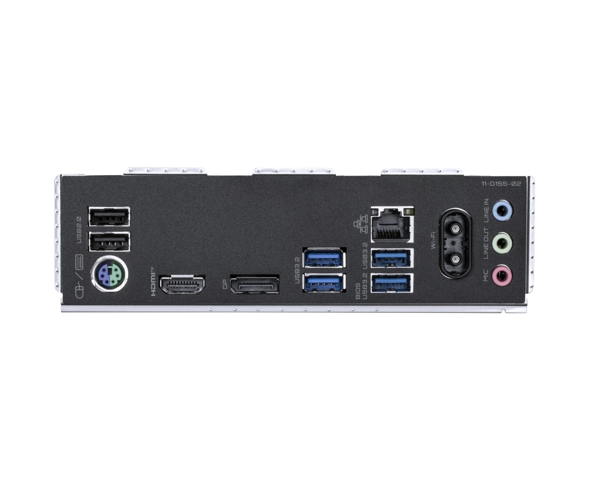 PS/2, 2 x USB 2.0, 4 x USB 3.2 Gen1, HDMI, DisplayPort, RJ-45
