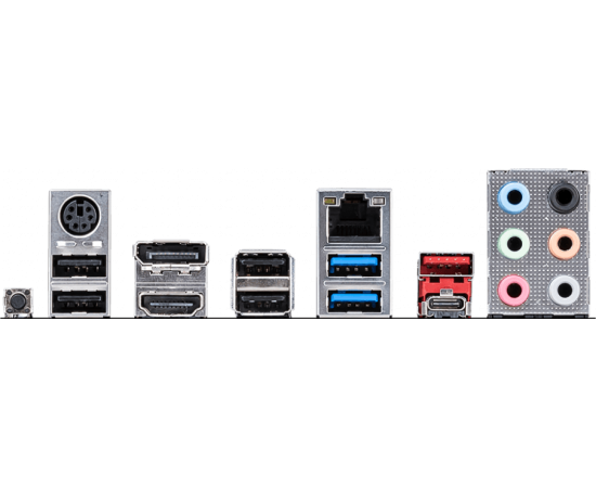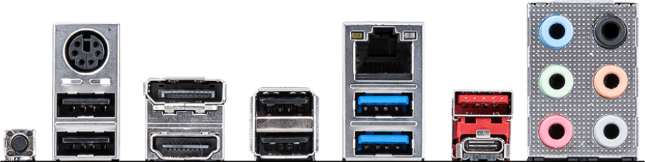 Разъёмы на задней панели : PS/2, 4 x USB 2.0, 2 x USB 3.2 Gen1, USB 3.2 Gen2, USB 3.2 Gen2 Type-C, HDMI, DisplayPort, RJ-45
