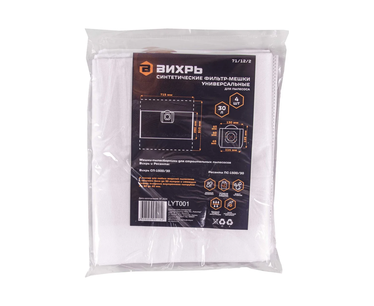 Мешки для строительного пылесоса Вихрь 71/12/2 синтетические 30л, 4шт