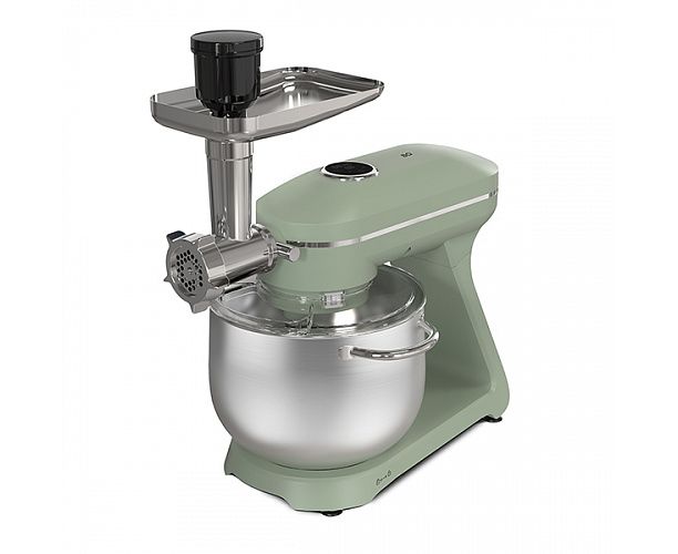 Планетарный миксер, чаша, крышка чаши, металлический венчик для взбивания, крюк для замешивания теста, насадка для смешивания, мясорубка, 3 диска для приготовления фарша, толкатель мясорубки, руководство по эксплуатации, гарантийный талон
