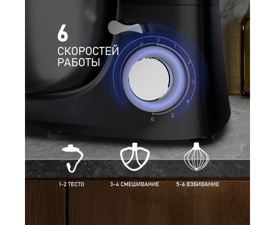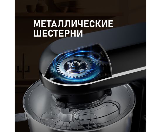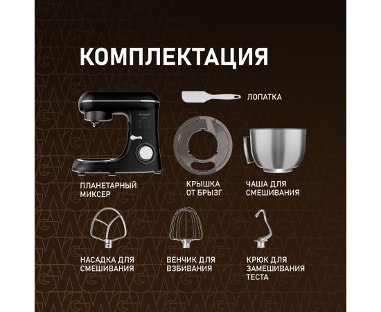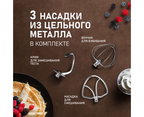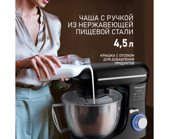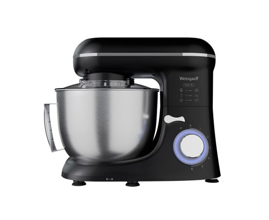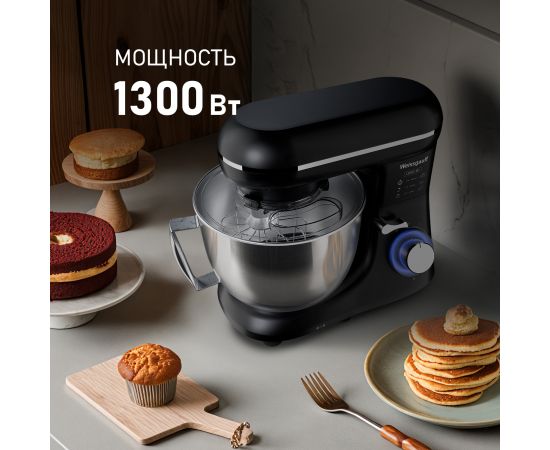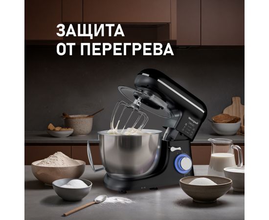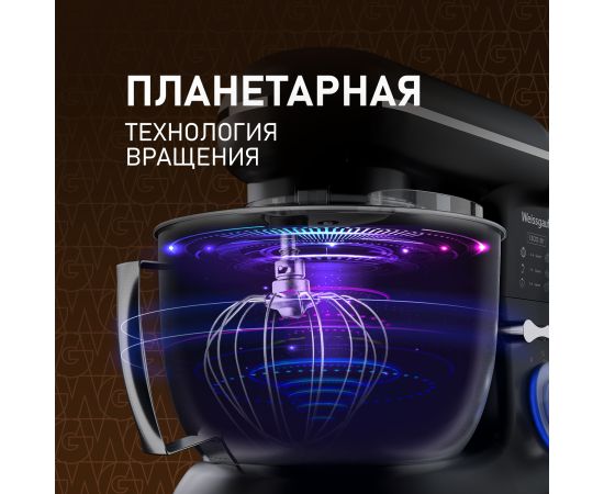 Электрический планетарный миксер от Weissgauff, обладающий впечатляющей мощностью 1300 Вт, оснащенный набором цельнометаллических насадок для теста и для смешивания, венчиком для взбивания, а также удобной чашей с крышкой - это незаменимый помощник на вашей кухне, который поможет вам воплотить в реальность самые смелые кулинарные идеи!