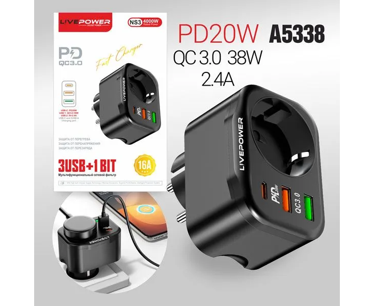 Многофункциональный сетевой фильтр Live-Power NS3 3USB+1 розетка (QC3.0+PD20W) 38W black
