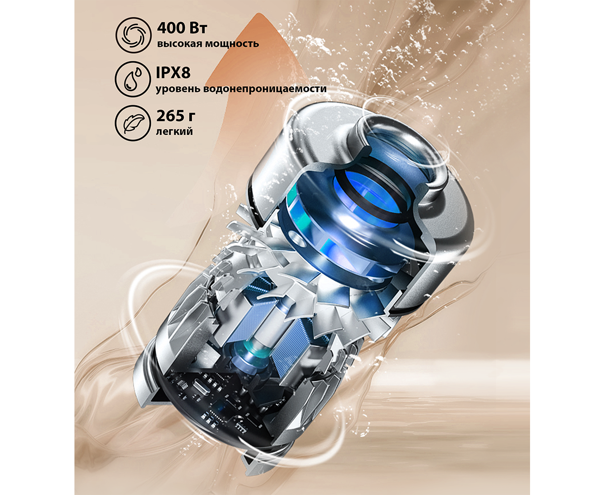Преимущества Мощность всасывания 100 аВт, Самоочистка и сушка горячим воздухом, Съемный аккумулятор, Двигатель IPX8 мощностью 400 Вт, Комплектация 3 в 1, Портативная конфигурация для уборки мебели