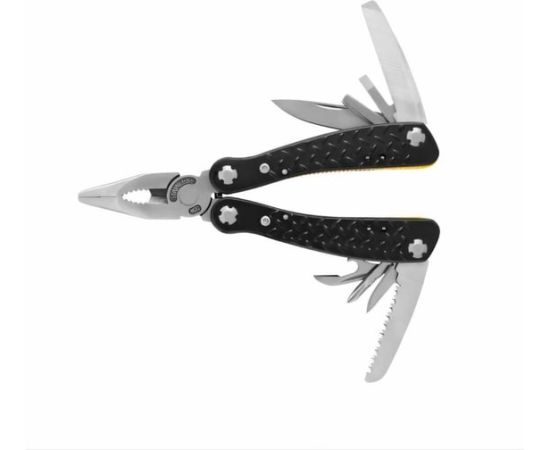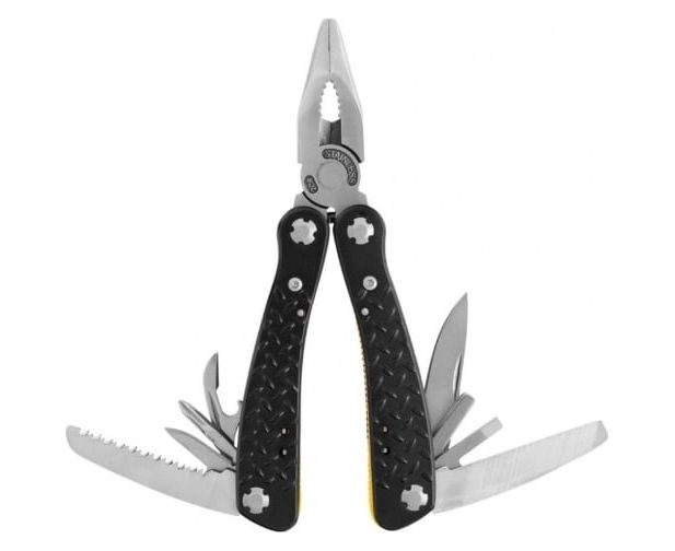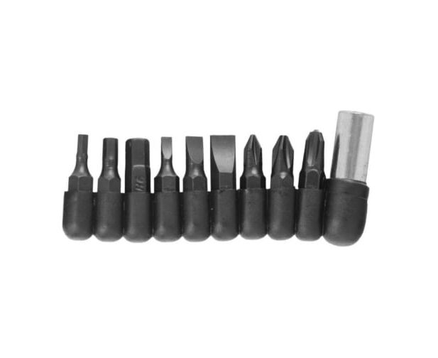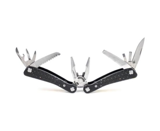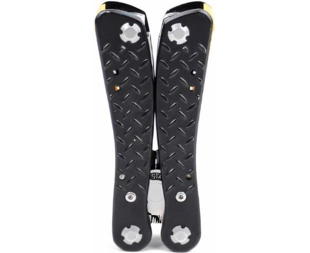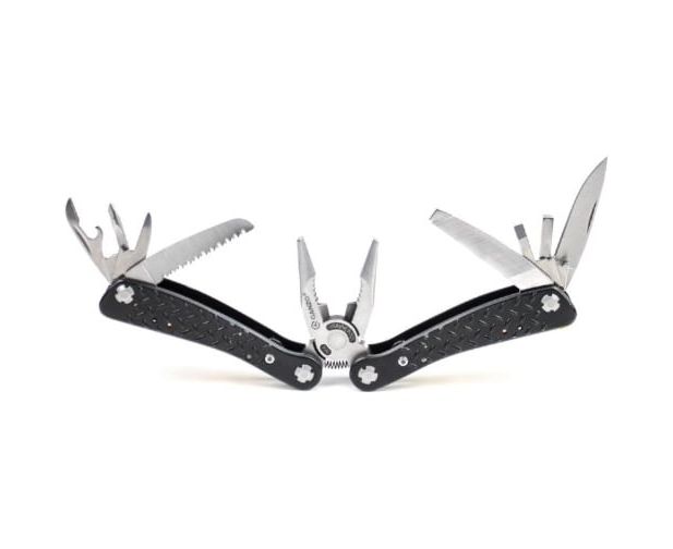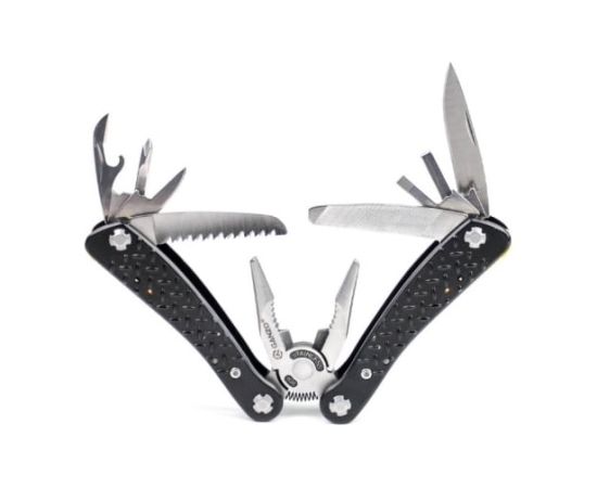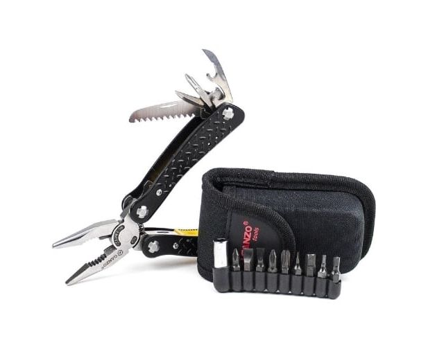 лезвие с прямой заточкой, серрейтор, две плоские отвертки, напильник, шило, открывалка для бутылок, консервный нож, держатель для бит