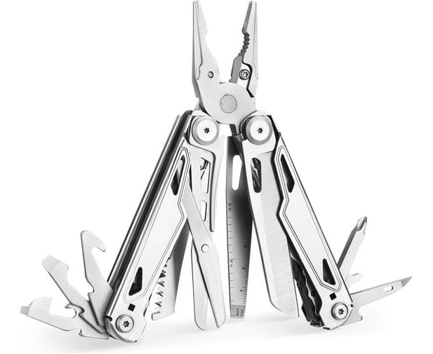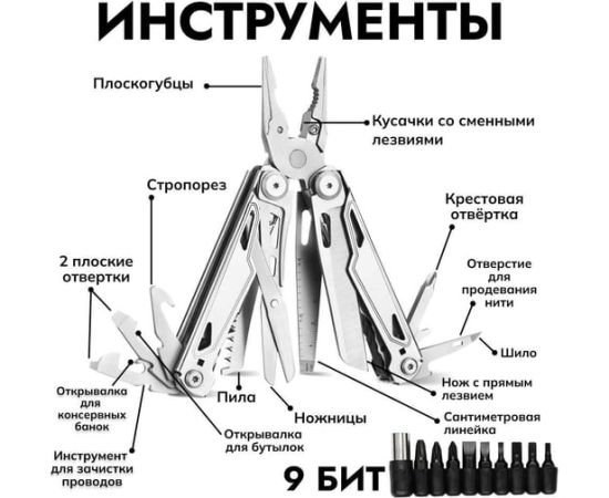 кусачки со сменными лезвиями, плоскогубцы, ножницы, пила, нож с прямым лезвием, сантиметровая линейка, шило, стропорез, отверстие для продевания нити, 2 плоские отвертки, крестовая отвертка, инструмент для зачистки проводов, открывалка для бутылок, открыв