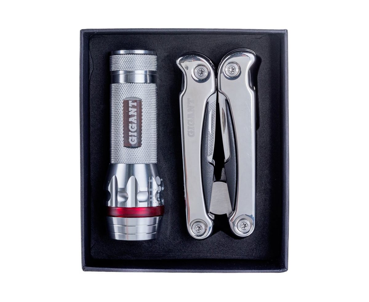 Набор мультитул Gigant 2 предмета G646 состоит из многофункционального инструмента и фонарика. Материал корпуса фонаря - сталь в сочетании с пластиком. Источником питания являются батареи типа ААА.