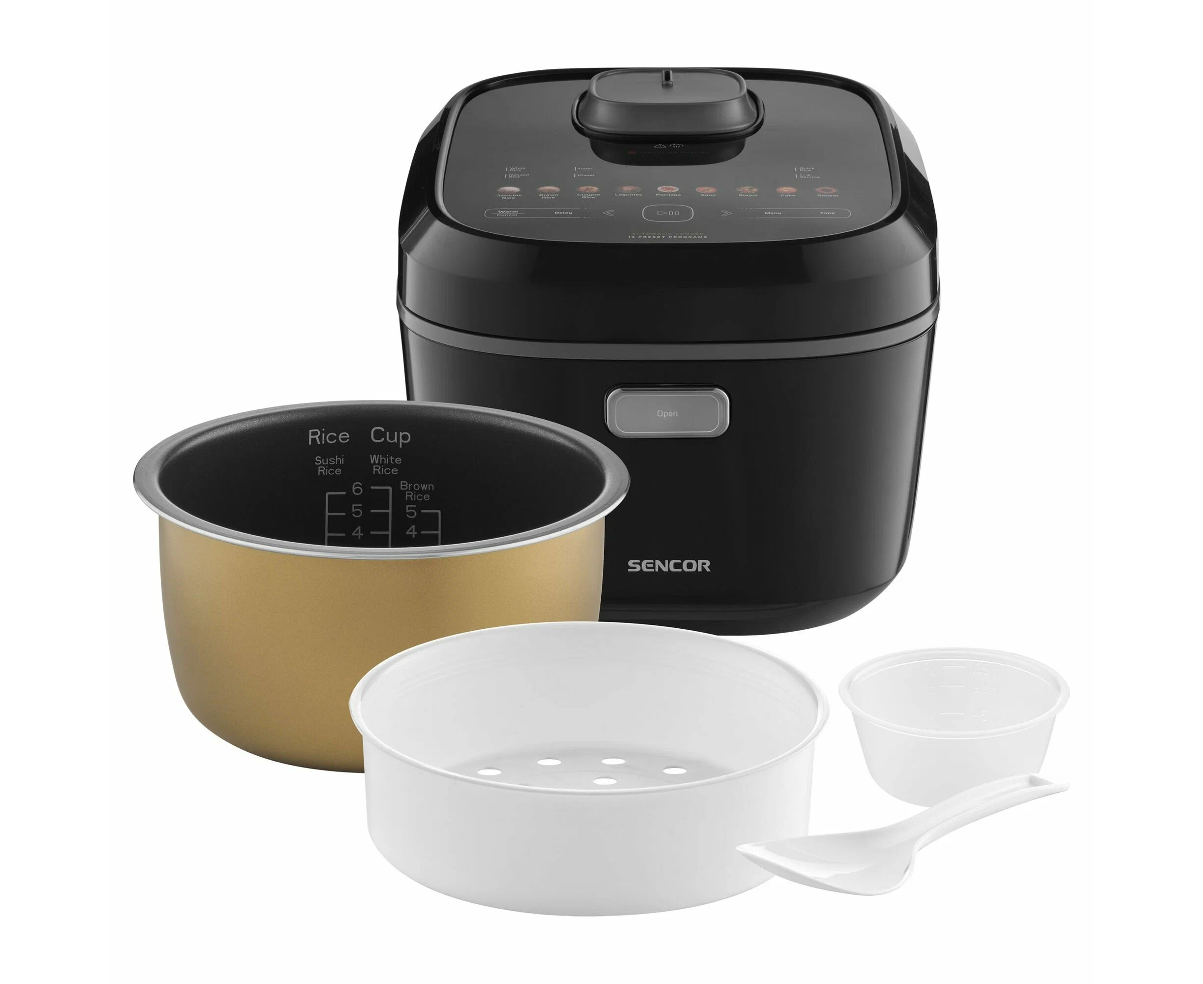 Рисоварка оснащена 13 автоматическими программами, включая приготовление супа, молочной каши, выпечки и приготовление на пару. Это позволяет приготовить разнообразные блюда из риса, а также другие продукты на пару.