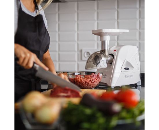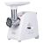 мощность 1500Вт, производительность 1.7кг/мин; количество скоростей 1; реверс; защита от перегрузки; насадка для колбас; материал лотка пластик; цвет белый