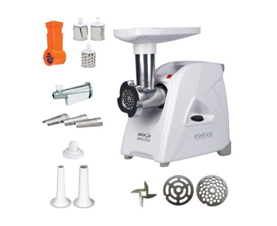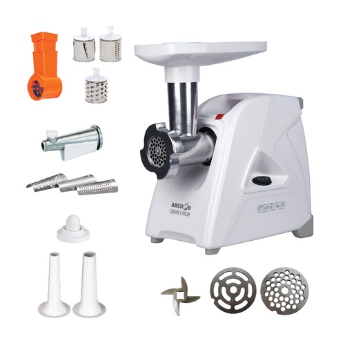 мощность 1500Вт, производительность 1.7кг/мин; количество скоростей 1; реверс; насадка для колбас; насадка для кеббе; насадка для соков; насадка-терка; насадка для шинковки; материал лотка пластик; цвет белый