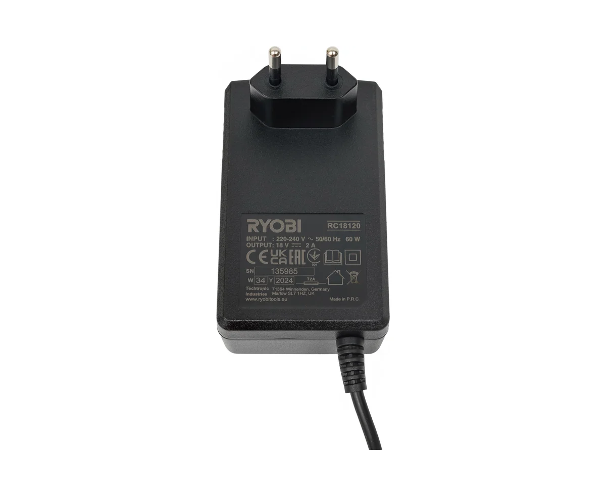 - Универсальное зарядное устройство позволяет доукомплектовывать набор любым аккумулятором Ryobi 18В