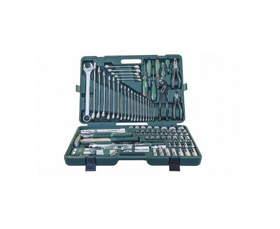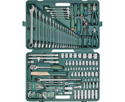Универсальный набор инструмента состоит из 127 предметов, что позволяет выполнять работы любой сложности. Кейс оснащен рукояткой для удобной транспортировки набора инструментов. Вес: 15.6 кг.