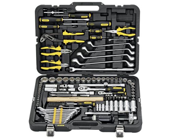1/4" (Super Lock): 6, 7, 8, 9, 10, 11, 12 мм; длинные 1/4" (Super Lock): 8,10,12 мм; Torx 1/4": E4, E5, E6, E7, E8; трещетка 1/4": 45 зубов; вороток т-образный 1/4": 110 мм; удлинитель 1/4": 50, 100 мм; гибкий удлинитель 1/4": 150 мм; карданный шарнир 1/4"; 1/2" (Super Lock): 13, 14, 15, 16, 17, 18, 19, 20, 21, 22, 24, 25, 27, 30, 32 мм; длинные 1/2" (Super Lock): 13, 14, 17, 19, 24, 27 мм; Torx 1/2": Е10, Е11, Е12, Е14, Е16 Е18, Е20, Е22; свечные 1/2": 16, 21 мм; трещетка 1/2": 45 зубов; вороток с шарниром 1/2": 375 мм; удлинитель 1/2": 125, 250 мм; карданный шарнир 1/2"