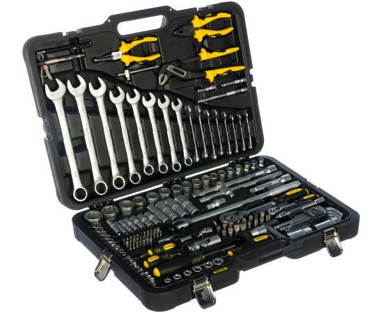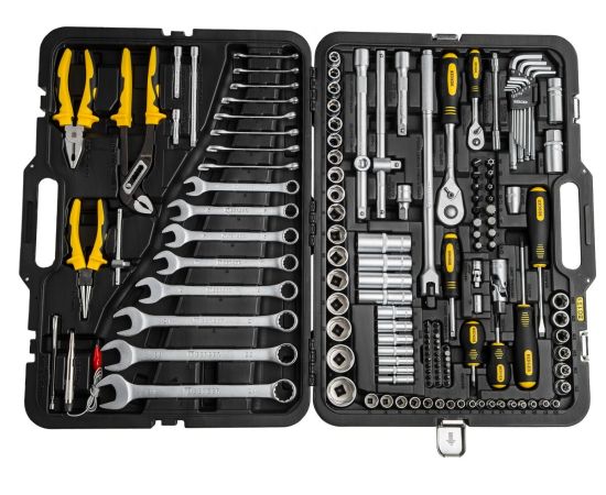 в комплекте: 1/4": трещотка (ключ трещоточный с быстрым сбросом) 45 зубов: 150 мм, вороток Т-образный: 110 мм, отвертка с присоединительным квадратом: 150 мм, удлинитель: 50, 75, 150 мм, удлинитель гибкий: 150 мм, кардан шарнирный, адаптер для бит; 1/2": трещотка (ключ трещоточный с быстрым сбросом) 45 зубов: 260 мм, вороток Т-образный с бегунком: 250 мм, вороток шарнирный: 375 мм, удлинитель: 50, 125, 250 мм, кардан шарнирный, переходник скользящий для удлинителей; 5/16": адаптер для бит; ручка магнитная телескопическая: 125-630 мм, автотестер 6-12-24 V; тип стали инструмента: CR-V (хром-ванадий); материал ручек инструмента: резинопластик; тип стали бит: S2