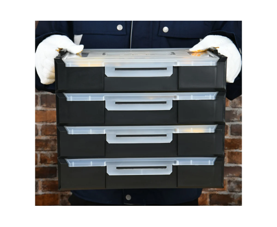 - Модульная система хранения - органайзеры соединяются между собой при помощи надежных пластиковых замков, позволяя создавать многоуровневые системы хранения.