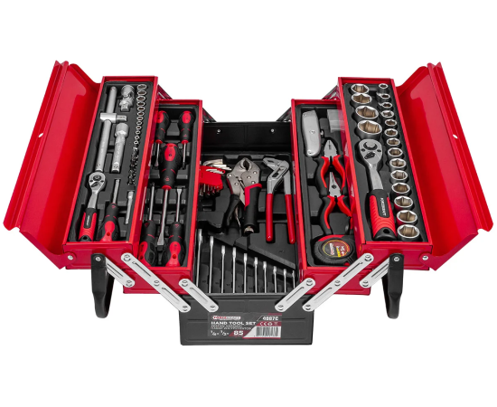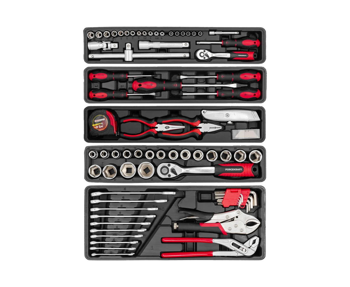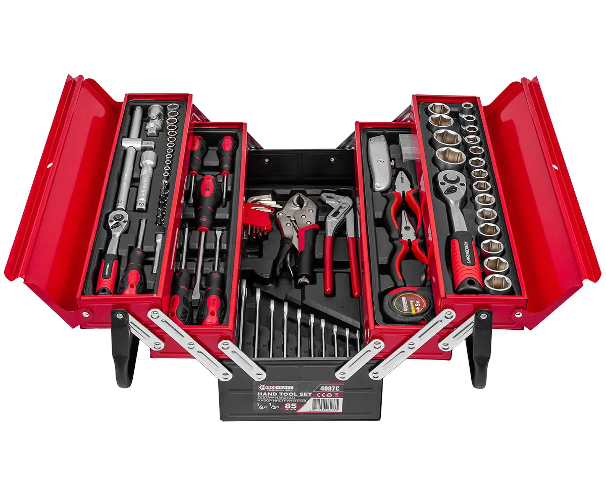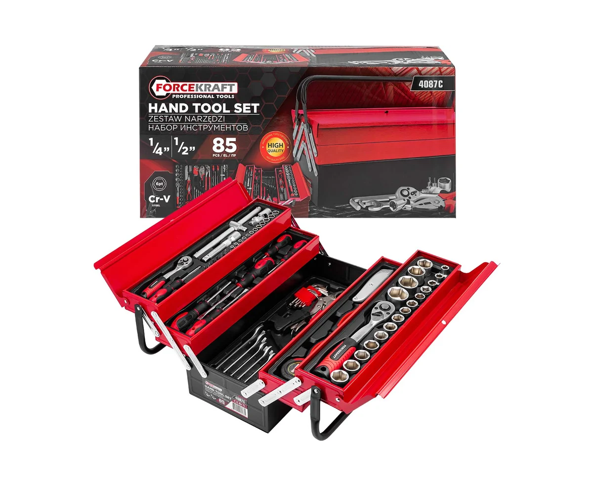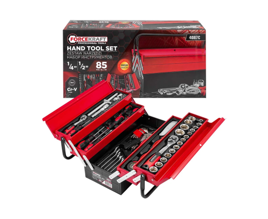 Набор инструментов от бренда Forcekraft из 85 предметов — это отличное решение как для профессионалов, так и для новичков, занимающихся ремонтными работами. Универсальный комплект включает в себя все необходимые инструменты для выполнения крепежных работ в доме, на даче, в гараже или в автомастерской.
