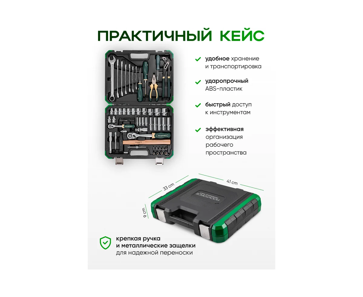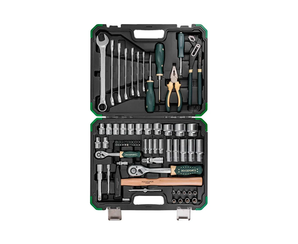 Набор инструментов Rockforce — это профессиональный комплект, состоящий из 74 предметов, который станет незаменимым помощником для любого автолюбителя и мастера. Все необходимые инструменты для обслуживания, ремонта и диагностики автомобилей, мотоциклов, велосипедов и другой техники упакованы в удобный кейс.