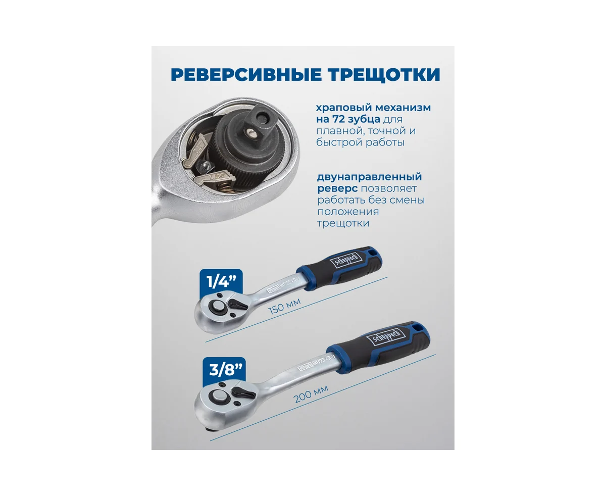 Универсальность. Благодаря наличию в наборе различных посадочных размеров (1/4 дюйма и 3/8 дюйма), инструменты подходят для выполнения как мелких, так и крупных ремонтных работ. Набор будет хорошим помощником в любой ситуации — замена свечей зажигания, работы с подвеской автомобиля или мелкие бытовые починки.