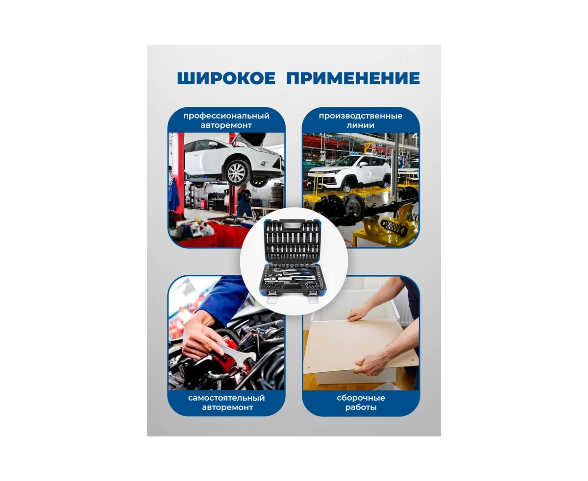 Многофункциональность. Набор из 108 предметов, включая торцевые головки различных размеров, свечные головки, головки-биты, удлинители, шарнирные карданы и шестигранные ключи. Это позволяет справиться с широким спектром задач — от обслуживания автомобиля до сборки мебели.