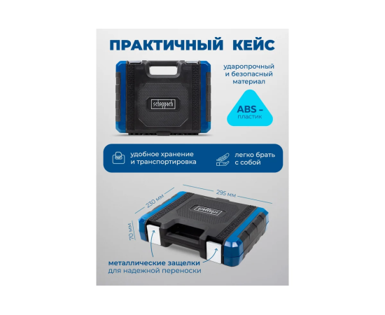 Удобство использования. Все инструменты аккуратно упакованы в прочный пластиковый кейс с металлическими защёлками. Каждый предмет имеет свою ячейку, которая позволит легко его найти в нужный момент и поддерживать порядок.