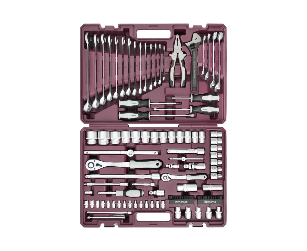 Инструментальные наборы Thorvik - это высокое качество изделий, входящих в состав наборов, удобные прочные кейсы для хранения, оптимальная комплектация позволяющая удовлетворить потребность мастера при обслуживании техники и обеспечить всем необходимым рабочее место при производстве комплексных слесарно-монтажных или механосборочных работ. Наборы Thorvik имеют ударопрочный морозоустойчивый кейс с надежными металлическими замками, фосфатированное покрытие вставок бит обеспечит дополнительную стойкость к коррозии. Область применения. Инструменты, представленные в наборе применяются при проведении работ связанных с обслуживанием изделий точной механики, электроники и бытовой техники, где рабочая зона ограничена и отсутствуют серьезные нагрузки. При производстве работ по обслуживанию автомобильной техники, благодаря небольшим размерам, набор незаменим для арматурных работ, ремонта и установки малых агрегатов и навесного оборудования двигателей.