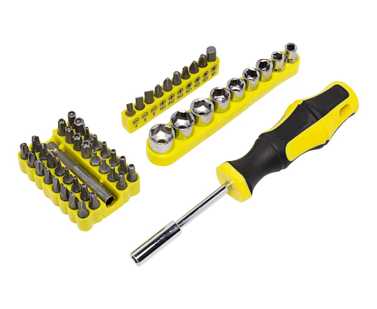 - Биты шлиц (4, 5, 6 мм.), биты PH (1, 2, 3), биты PZ (1, 2, 3), биты 25 мм. шлиц Torq-set (6, 8, 10), головка под вилочный ключ (4, 6, 8, 10), шлиц Tri-Wing (1, 2, 3, 4), Т (Т8Н, Т10Н, Т15Н, Т20Н, Т25Н, Т27Н, ТЗОН, Т35Н, Т40Н), Hex (2, 2.5, 3, 4, 5, 6 мм.), Hex (5/32", 9/64", 1/8", 7/64", 3/32", 5/64");