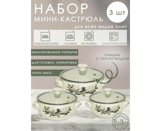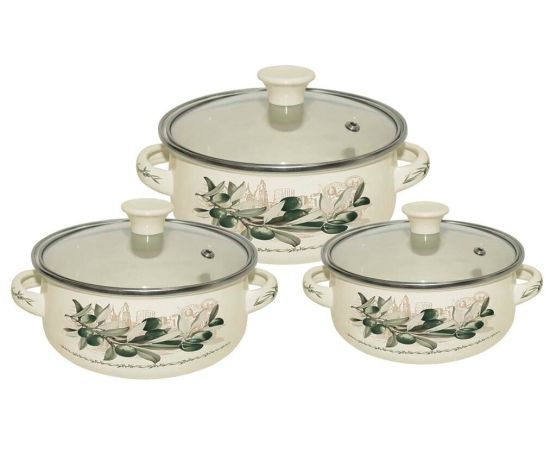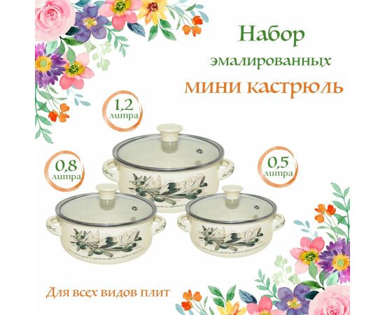3 кастрюли: 0.5 л, 0.8 л, 1.2 л; 3 крышки