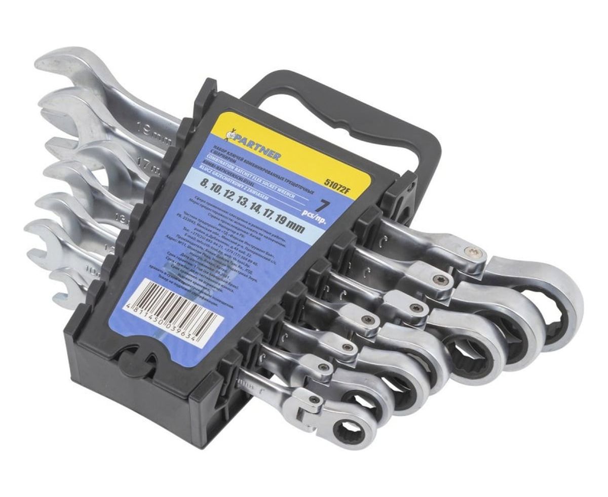 Набор ключей комбинированных Partner PA-51072F(52454) трещоточных с шарниром (8,10,12,13,14,17,19мм), 7 предметов