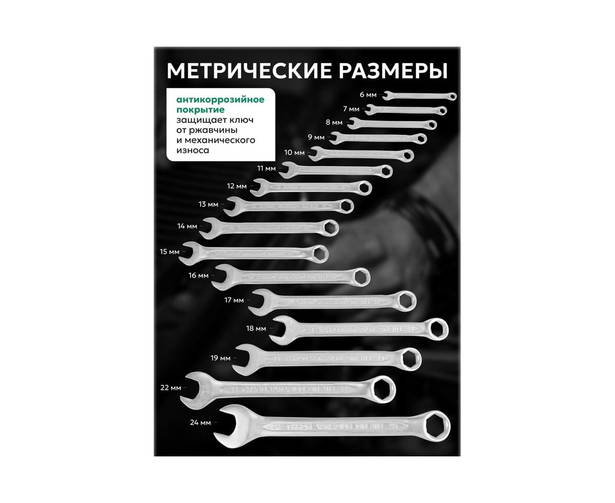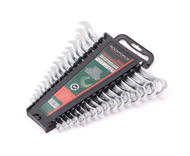 Набор комбинированных ключей ROCKFORCE на пластиковом держателе включает 16 наиболее востребованных размеров и представляет собой универсальный слесарно-монтажный инструмент. Каждое изделие сочетает в себе рожковый и накидной профили одинакового размера, обеспечивая удобство работы в различных условиях.