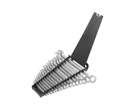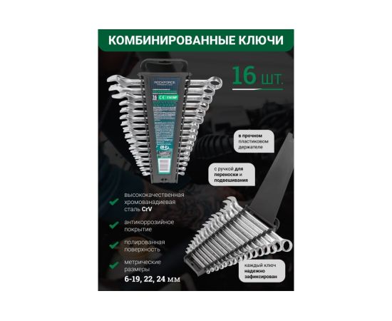 Набор ключей комбинированных, 16 предметов от бренда ROCKFORCE - ручной инструмент для работы с различными резьбовыми соединениями. Накидная часть применяется для работы с тугими крепежными соединениями, а рожковая применятся, если нет возможности накинуть ключ на соединение сверху - в таком случае можно работать с какой-то из сторон рожковым гаечным ключом.