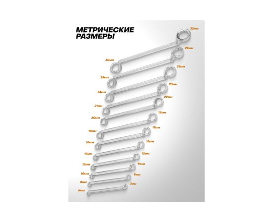 Размеры ключей: 6х7, 8х9, 10х11, 12х13, 14х15, 16х17, 18х19, 20х22, 21х23, 24х27, 25х28, 30х32 мм