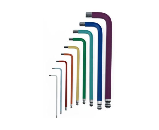 Набор шестигранников NORGAU COLOUR удлиненные, 9 шт N42CEL-009 061001809 имеет маркировку размерного ряда на держателе. Для облегчения поиска каждый шестигранник имеет цветовую индикацию. Сферическая головка позволяет работать с винтами под углом 25° в труднодоступных местах.