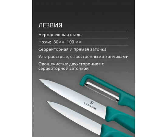 Состав комплекта В комплекте зеленых 2 ножа с прямой и серрейт заточкой, длиной лезвия 8 и 10 см, овощечистка Iota c двойным лезвием и серрейт заточкой