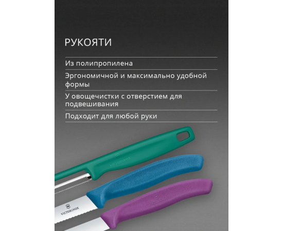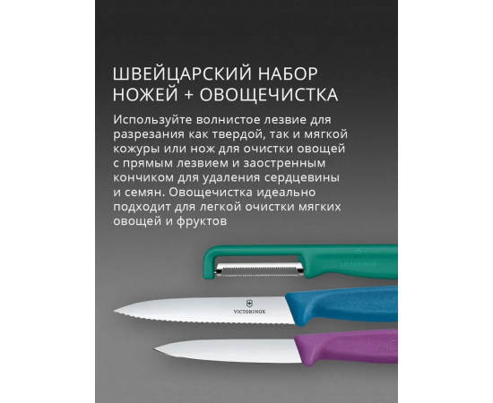 В комплекте 2 ножа фиолетового и синего цвета с прямой и серрейт заточкой, длиной лезвия 8 и 10 см, овощечистка Iota зеленого цвета c двойным лезвием и серрейт заточкой