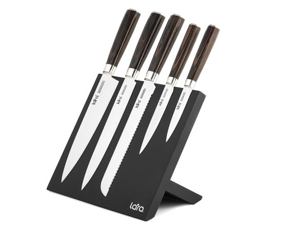 Набор ножей LARA отличается премиальным качеством исполнения. В набор входят магнитная подставка для хранения и пять ножей: для нарезки, овощей, хлеба, универсальный и поварской.