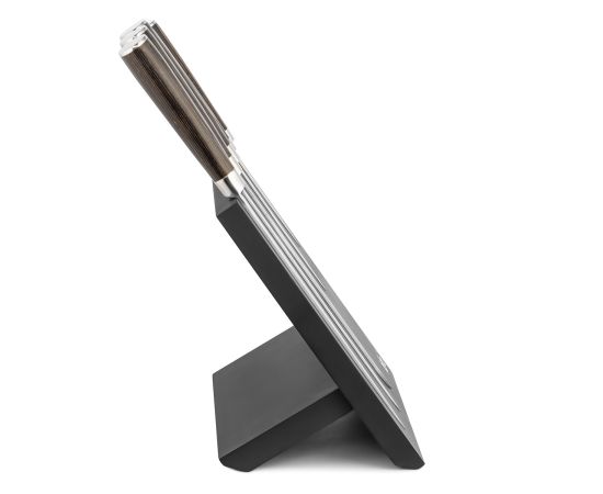 Эргономичная рукоять ножа выполнена из древесины и устойчива к влаге. Магнитная подставка из черного МДФ высокой плотности.