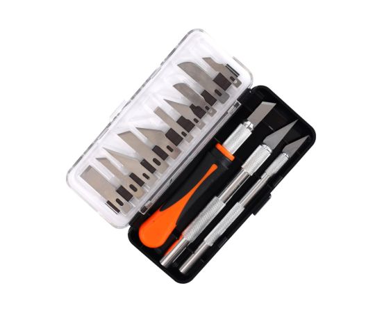 Комплект ножей PATRIOT PKS-16 со сменяемыми лезвиями для резки тонких материалов. В комплекте идёт 13 стальных полотен разной формы и три рукояти разной толщины.