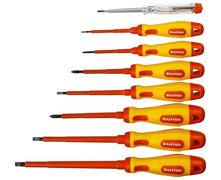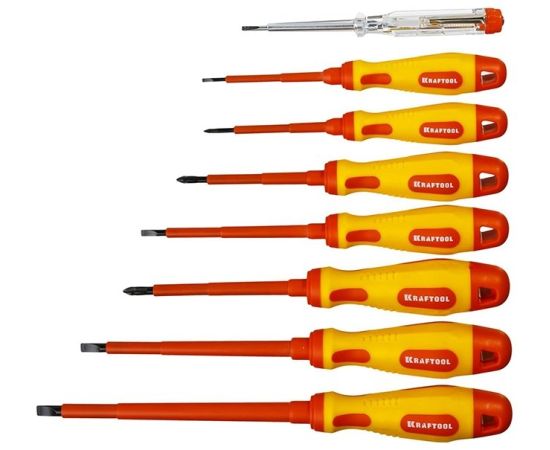 Описание: Профессиональный набор ВЫСОКОВОЛЬТНЫХ ОТВЁРТОК KRAFTOOL. Кованый закаленный хромомолибденованадиевый стержень. Предназначен для работ с высочайшим уровнем безопасности под напряжением до 1000 В. Каждая единица продукции прошла тестирование на пробой 10000 В.