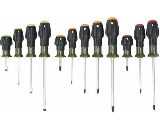 Набор отверток рассчитан на выполнение как лёгкого кручения, так и на приложение большего усилия. Продуманная форма рукоятки, состоящая из прорезиненного элемента и пластика, устойчивого к влиянию агрессивных веществ, надёжно фиксируется в руке в момент кручения и не позволяет отвёртке скатываться по наклонной поверхности. Цветовая индикация на торцевой части рукоятки позволяет быстро определить требуемый профиль отвёртки. Отвёртки изготовлены методом холодной штамповки с последующей термообработкой и защищены от коррозии хромированием.