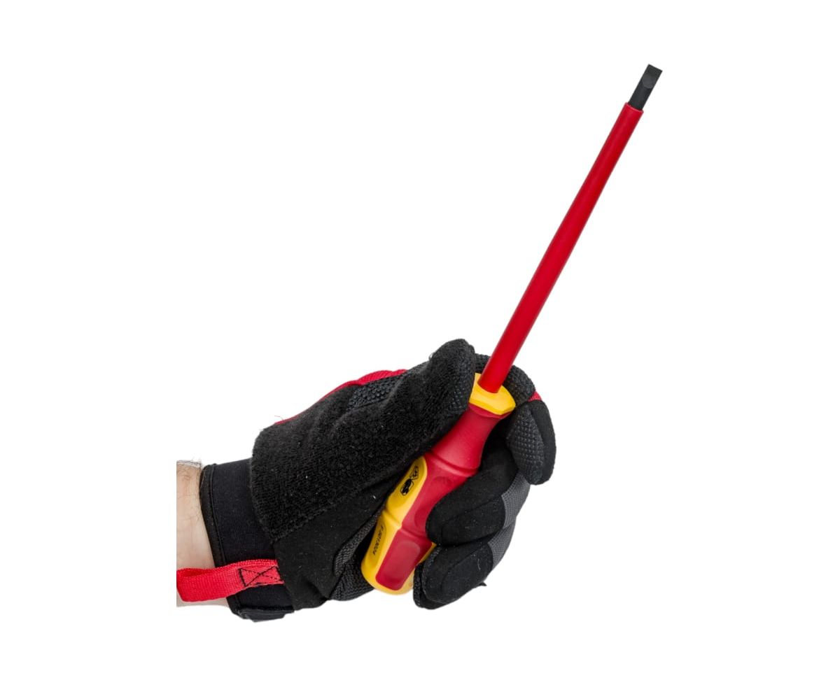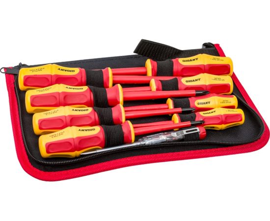 Набор диэлектрических отверток Gigant GBSD-5 рассчитан на работу с мелким и крупным крепежом с пазом типа Philips и шлицевым. Рукоятки выполнены из двухкомпонентного материала и отлично подходят для работ под напряжением до 1000 В. Есть отвертка-индикатор, которая помогает определить наличие тока в розетке или проводах.