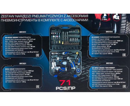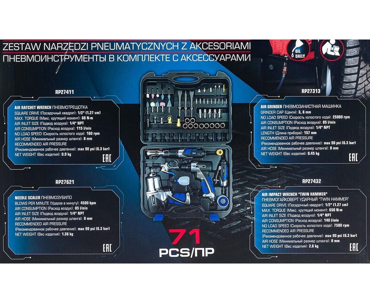 В составе набора пневмогайковерт "TWIN HAMMER" 1/2 650Нм, пневмозубило 4500 уд/мин, пневмотрещотка 1/2 68Нм, пневмошлифмашинка 25000 об/мин, пистолет для подкачки с манометром 0-8.5бар, продувочный пистолет, аналоговый манометр и аксессуары.
