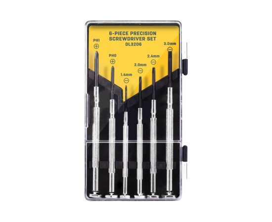 Набор прецизионных отверток DELI DL3206 6 шт. подходит для ремонта и обслуживания игрушек, часов, очков, инструментов, бытовой техники и различного прецизионного оборудования. Наконечник с антикоррозийным чёрным покрытием обеспечивает высокий контроль при работе отвертками. Вращающийся колпачок облегчает вращение крепежа. Никелированная ручка обладает антикоррозийной стойкостью и долговечностью. Отвертки изготовлены из углеродистой стали, что обеспечивает высокую прочность и надежность.