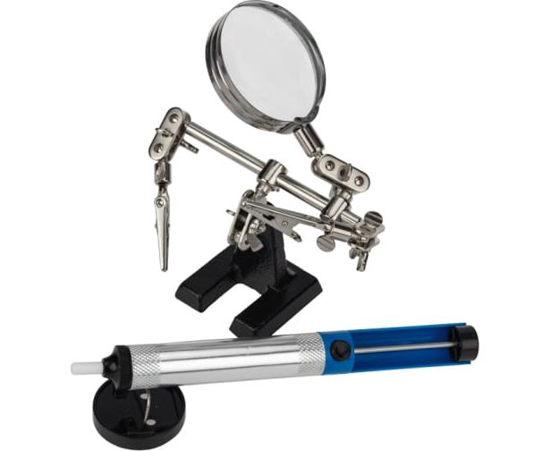 Держатель размером 268x200x55 мм станет третьей рукой мастера, поскольку возьмет на себя задачи по фиксации элементов и деталей, необходимых для монтажа. Инструмент состоит из устойчивого чугунного основания, шарнирного соединения с подвижными во всех плоскостях зажимами типа "крокодил", покрытыми никелем, и лупы с 3-кратным увеличением (возможность регулировки положения). С помощью лупы диаметром 60 мм можно рассмотреть даже мелкие детали при проведении паяльно-сборочных работ в электронике, ювелирном деле, сборке и ремонте.