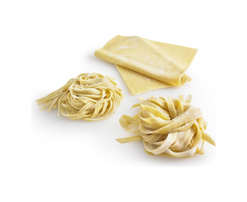 Набор включает три насадки: для раскатки теста, нарезки спагетти и фетучинни. Насадка для раскатки теста имеет 8 настроек толщины теста.