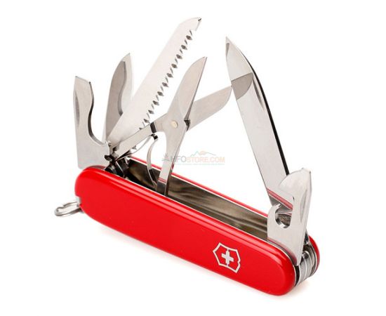 Список функций: Большое лезвие; Малое лезвие; Крестовая отвертка; Консервный нож с: малой отверткой; Открывалка для бутылок с: отверткой, инструментом для снятия изоляции; Шило, кернер; Кольцо для ключей; Пинцет; Зубочистка; Ножницы; Многофункциональный крючок; Пила по дереву