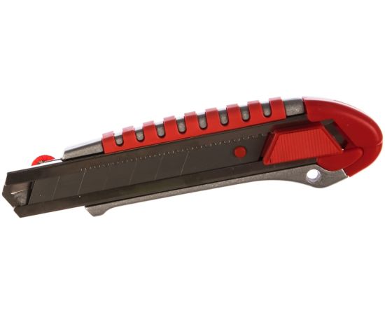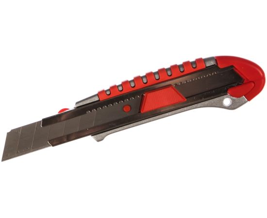 Прочный металлический корпус инструмента обладает удобной обрезиненной рукояткой, что увеличивает его эксплуатационные свойства. Стальное лезвие фиксируется автоматически, также предусмотрен дополнительный замок. Когда крайний сегмент затупляется, его можно отломить и продолжить использование инструмента Качественные материалы обеспечивают долговечное использование.
