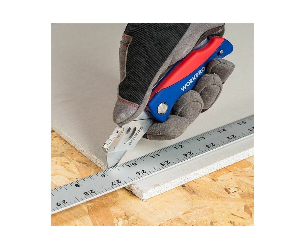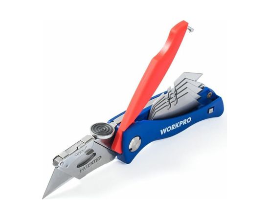 Складной быстросменный нож WORKPRO трапециевидные лезвия WP211006 используется для резки ковра, бумаги, пластика, кожи, картона, алюминиевого листа и др. Специальный механизм обеспечивает быструю смену лезвий. Острое закаленное лезвие выполнено из стали SK5, обладающей высокой прочностью и долговечностью. Зажим для ремня служит для удобной носки ножа на ремне брюк. Рукоятка из ABC-пластика обладает стойкостью к износу, легким весом и эргономичной формой. 5 дополнительных лезвий удобно хранятся в рукоятке.