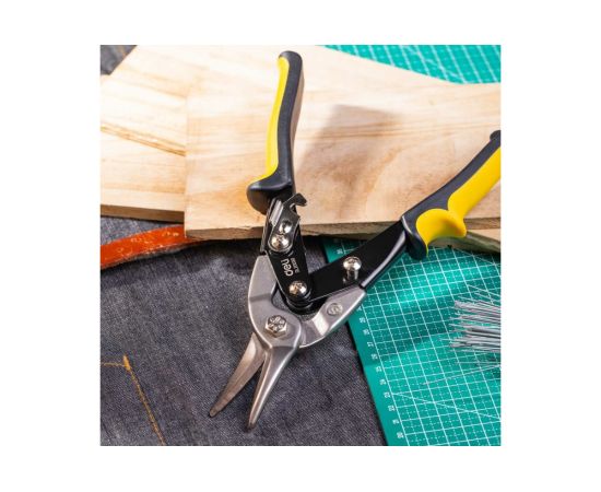 Ножницы по металлу используются в мастерских, на производствах, при проведении ремонтных работ и предназначены для разрезания листов из цветных металлов, холоднокатаной или нержавеющей стали. Рабочие части изготовлены из высокопрочной хромованадиевой стали и обладают высокой твердостью, что определяет длительный срок службы инструмента. Двухкомпонентная эргономичная рукоятка имеет упоры для пальцев. Это обеспечивает надежный захват материала без проскальзывания.