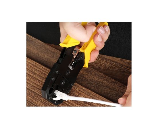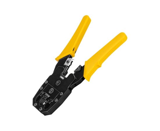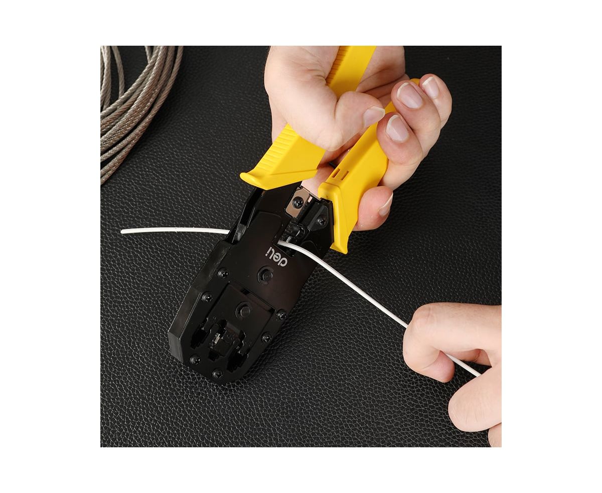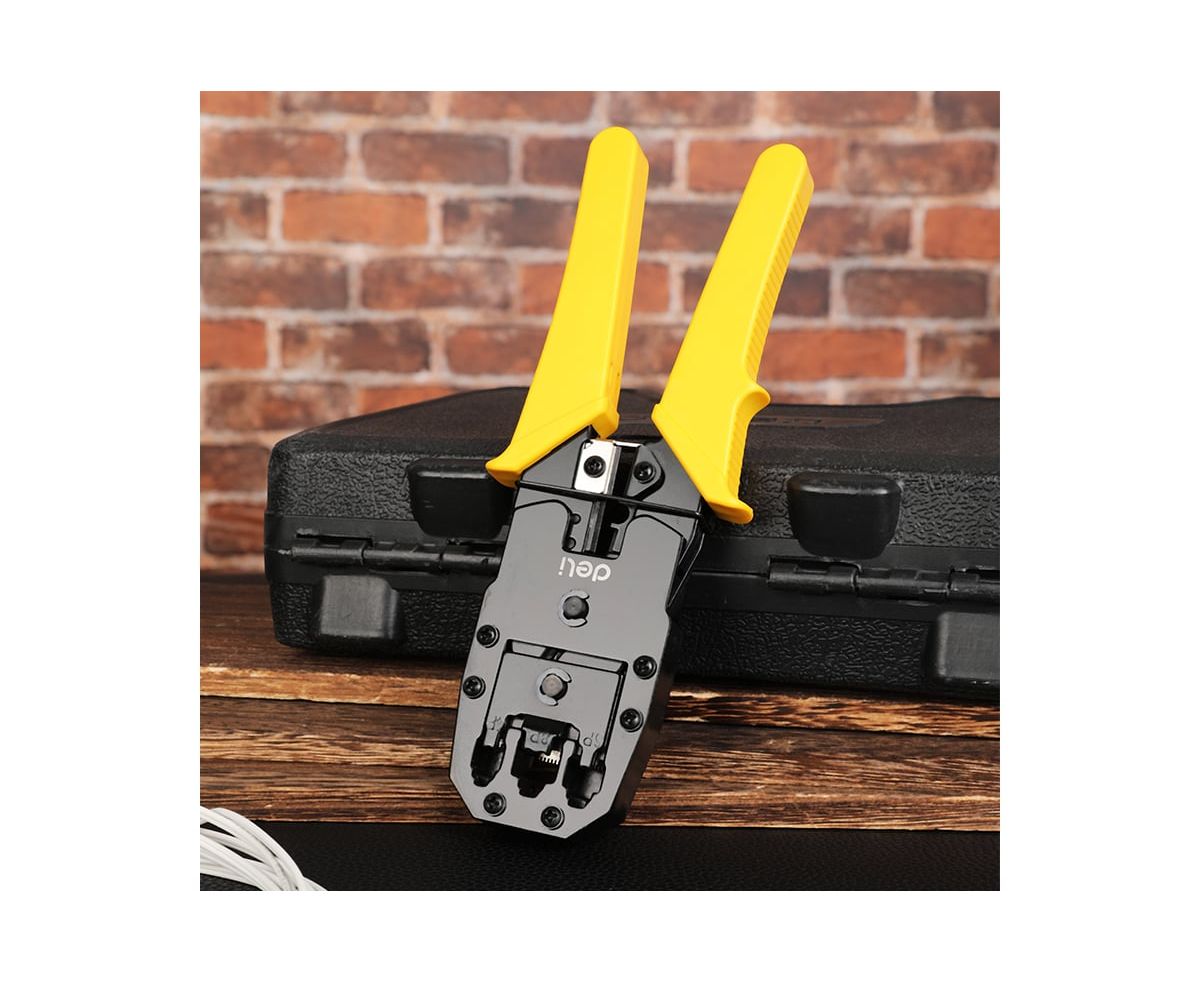 Обжимные клещи - незаменимый инструмент для профессионалов и любителей, которые ищут надежное и удобное решение для обжима различных коннекторов. Клещи изготовлены из холоднокатаного стального листа углеродистой стали с чёрной отделкой. Материал обладает высокой прочностью и долговечностью. Благодаря пластиковой, ребристой ПВХ-ручке с упором для пальца снижается усталость кисти при работе с инструментом. DL2468C обладают впечатляющим функционалом и высокой производительностью, позволяющими без труда работать с коннекторами 8P (RJ-45), 6P (RJ-14 и RJ-12) и 4P (RJ-9).