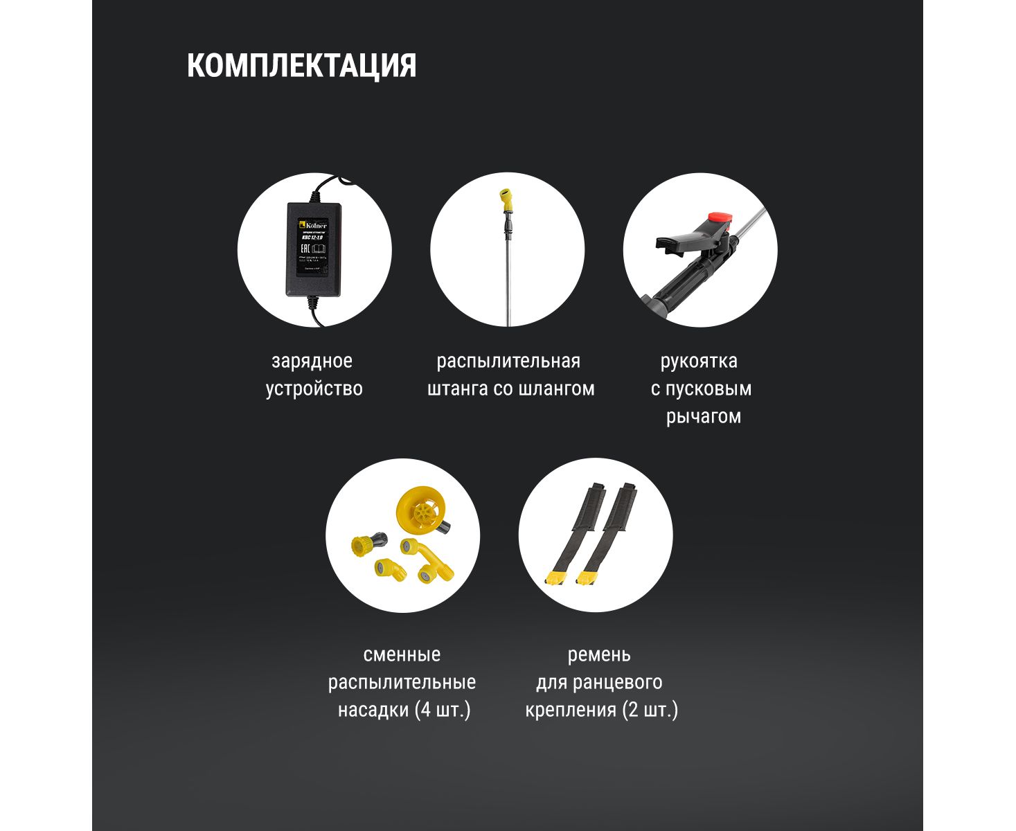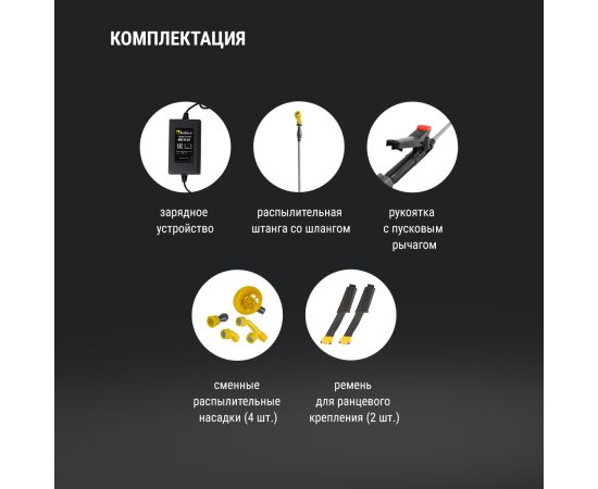 В комплекте Аккумулятор, Зарядное устройство, Распылительная штанга, шланг, Рукоятка с пусковым рычагом, сменная распылительная насадка- 4 шт., Ремень для ранцевого крепления - 2 шт., Уплотнительное кольцо - 1 комплект